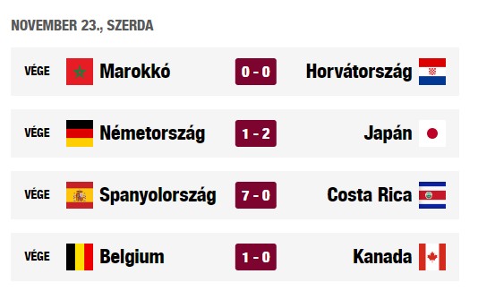 A csoport másik meccsén történelmet írt Spanyolország, amely 7–0-ra verte Costa Ricát, ezzel új gólrekordot állított fel saját vb-történetében. Az F csoport feledhetőbb meccseket hozott, Marokkó és Horvátország nem bírt egymással, Belgium nehezen, 1–0-val érvényesítette Kanada ellen a papírformát.
