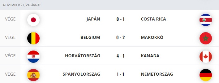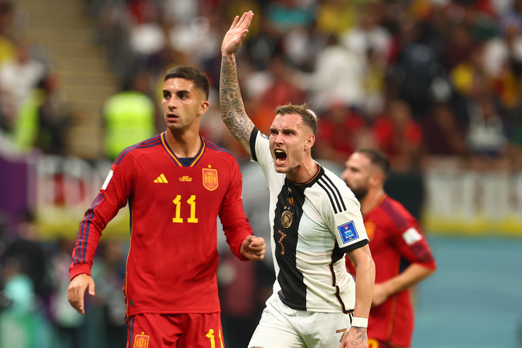 A katari labdarúgó-világbajnokság csoportkörének legnagyobb rangadóján a 2010-es aranyérmes spanyolok 1–1-es döntetlent játszottak a végjátékban szépítő négyszeres győztes németekkel.
